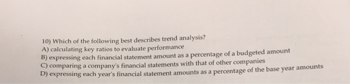A calculating key ratios to evaluate performance B expressing each financial statement amount as a percentage of a budgeted amount C comparing a companys financial statements with that of other companies D expressing each years financial statement amounts as a percentage of the base year amounts 20. Which of the following would best support the authors claim that more slaves were needed after the invention of the cotton gin. A It is a measure in the monetary value of the long-term damage done by a.