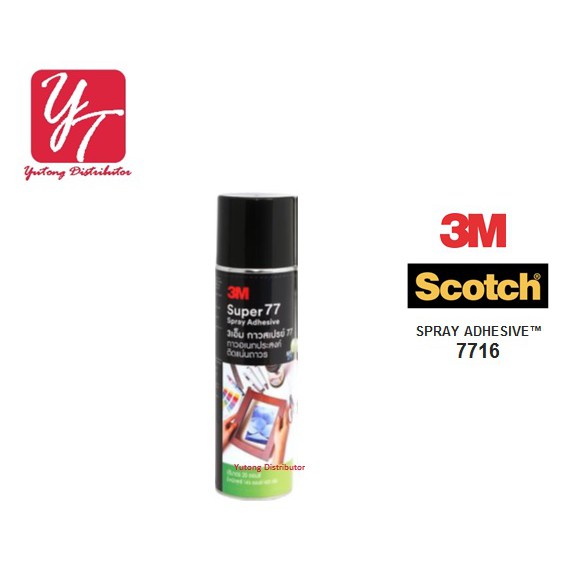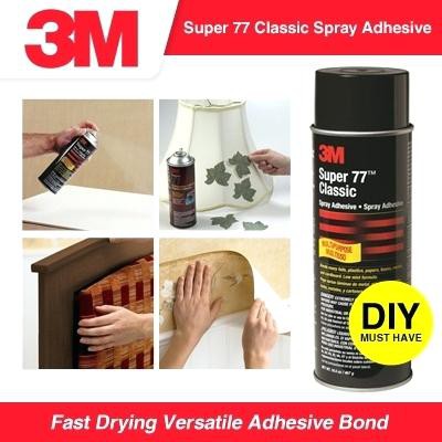 Scotch 77 spray adhesive. Our 3M Super 77 Multipurpose Spray Adhesive has an aggressive tack that offers a high initial grab as well as sufficient open time to position materials properly. Scotch Super 77 Spray Adhesive is an extremely versatile fast drying spray adhesive that bonds a wide range of lightweight materials. Its fast aggressive tack and low soak in make it ideal for a broad range of projects.