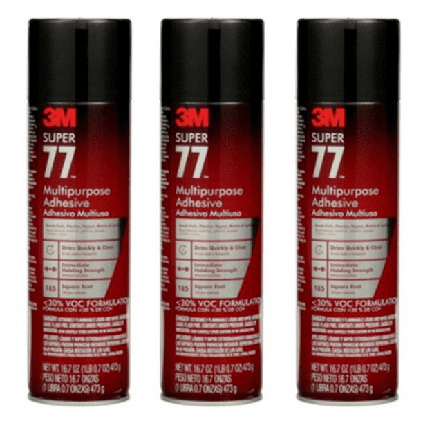 Its fast aggressive tack and low soak in make it ideal for a broad range of projects. Formulated with high tack high coverage fast drying and long bonding range. 3M Super 77 Multipurpose Permanent Spray Adhesive Glue Paper Cardboard Fabric Plastic Metal Wood Net Wt 1675 oz 45 out of 5 stars 2630 Install Bay Adhesive Spray 3M 77 - 1675 Ounce. Its fast aggressive tack and low soak in make it ideal for a broad range of projects. Strong durable bond Bonds quickly and works on a broad range of surfaces Bonds to fabric cardboard plastic metal. 3M SUPER 77 SPRAY ADHESIVE how to instructional video. Scotch Super 77 Spray Adhesive is an extremely versatile fast drying spray adhesive that bonds a wide range of lightweight materials. High-solids content supports its low soak-in property giving you time to find the best fit for your parts. 3M Super 77 Spray Adhesive.
